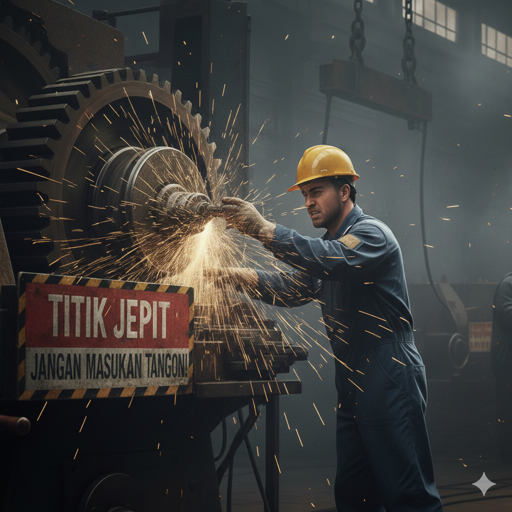 - Titik Jepit (Pinch Points): Bagian mesin yang bergerak yang dapat menjepit jemari atau pakaian.